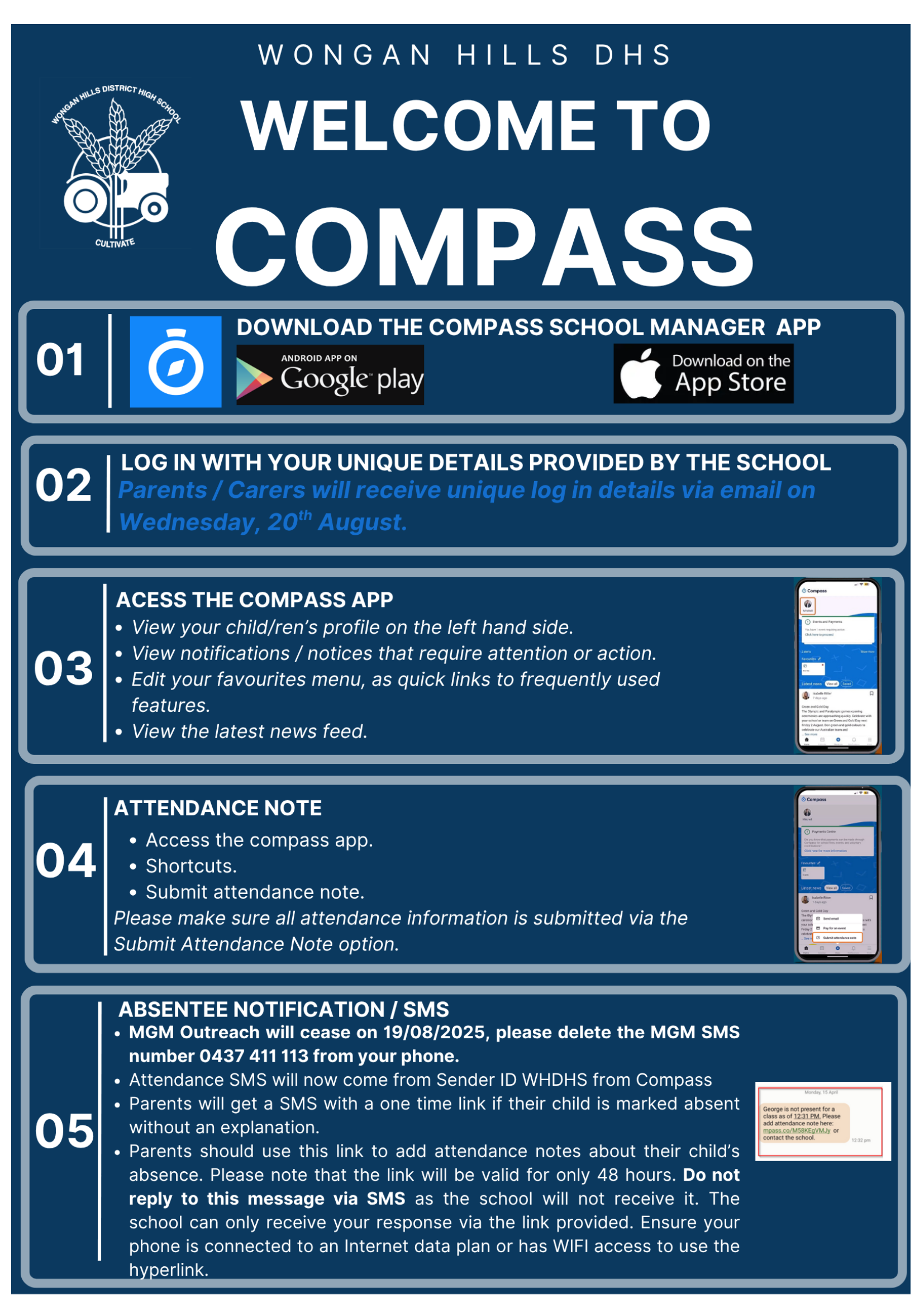 Parents have be given access to the Compass School Manager App with thier unique log in details.